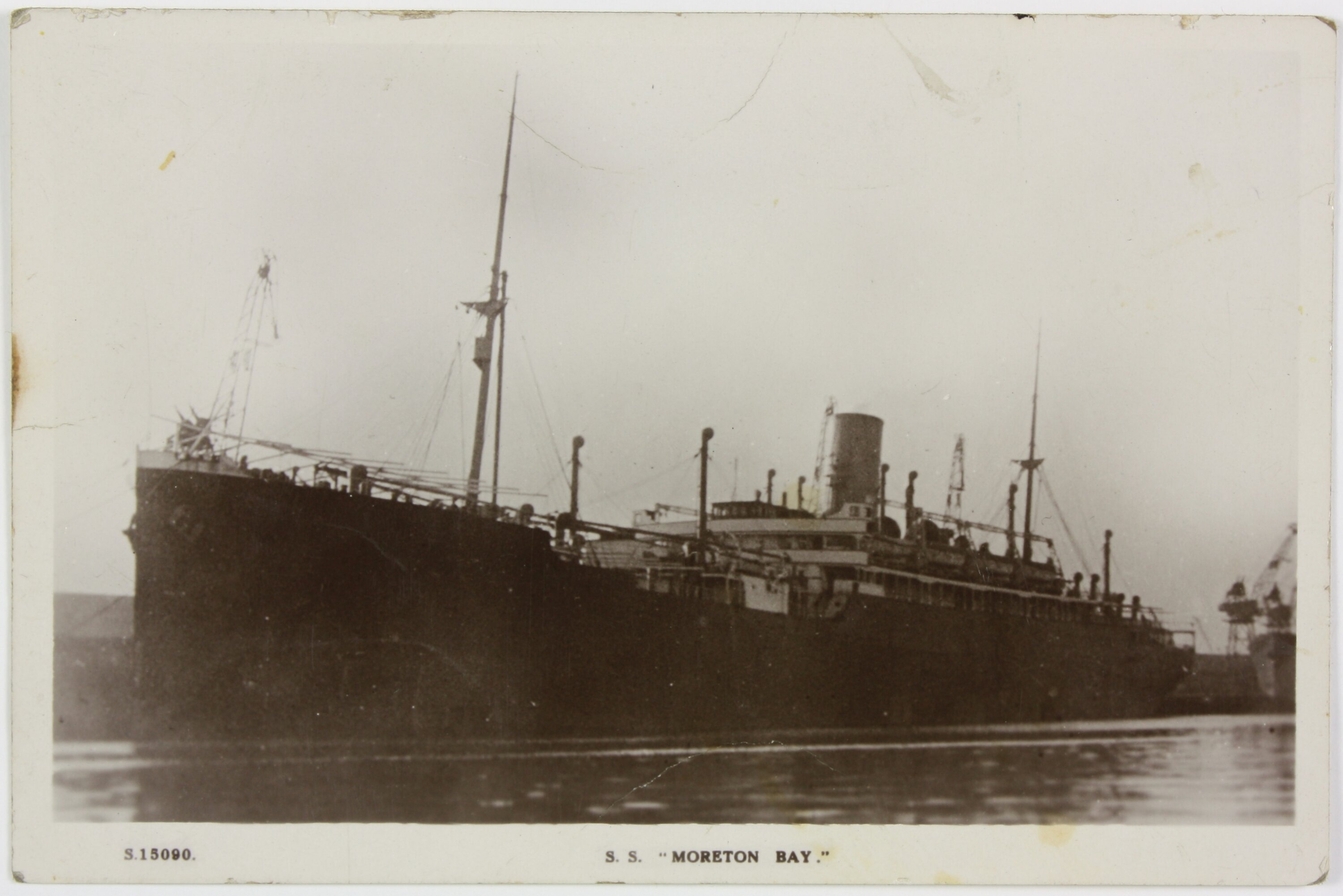 Printed in black text on the front of postcard: 'S. 15090 / S. S. 'MORETON BAY.'' Printed in black text on the back of postcard: 'POST CARD / Printed in Great Britain / Correspondence / Address Only / Kingsway / Real Photo / Card / KINGSWAY REAL PHOTO SERIES'