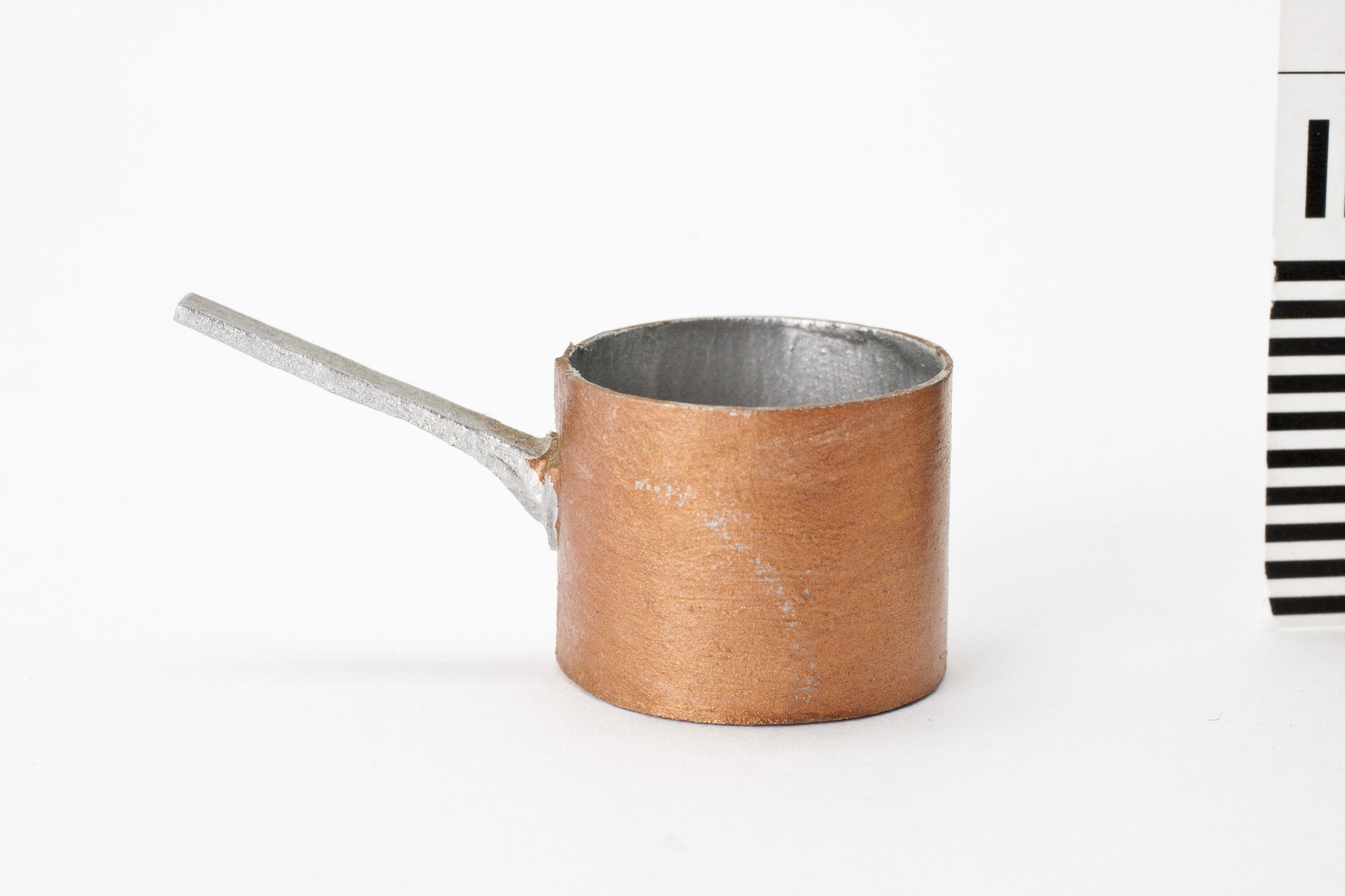 Copper coloured saucepan with a silver handle made from balsa wood.