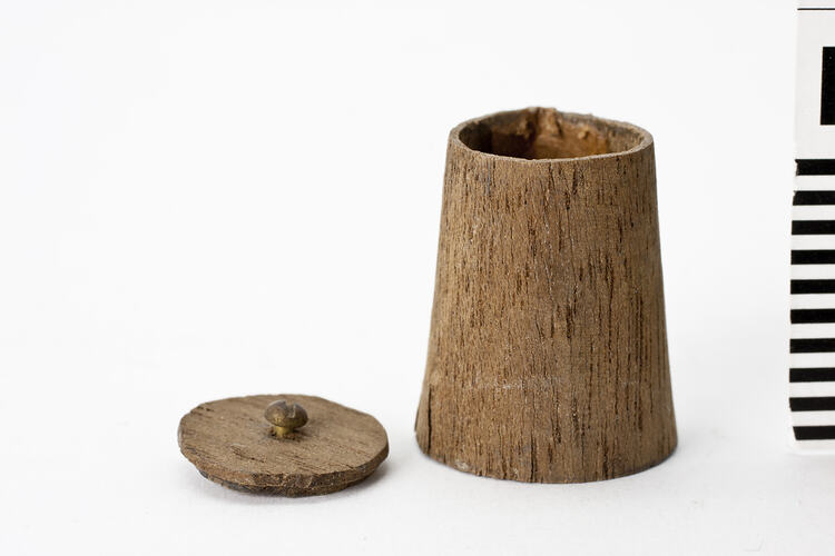 Round wooden container with lid.