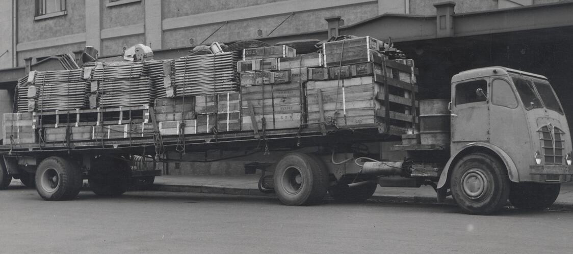 Handwritten in pencil on back, 'TRUCK LOAD OF MACHINERY / LOADED FOR EXPORT / PHOTO TAKEN OUTSIDE / H/O SUNSHINE / NOV 1950' In blue stamp pad ink, 'H.V.McKAY MASSEY HARRIS PTY.LTD. / SUNSHINE 13 NOV 1950'