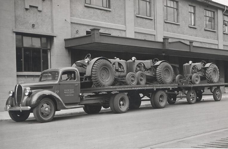 A tray truck (Possibly a Ford) and trailer loaded with 3 Massey Harris Pacemaker tractors. It is possible that as these tractors are marked with a number (AF11397) these tractors are to be supplied to the R.A.A.F.. Note the modified underslung exhaust system to allow passage under aeroplanes. Truck is numbered 27, and is signed H.V.McKay Massey Harris PtyLtd Sunshine