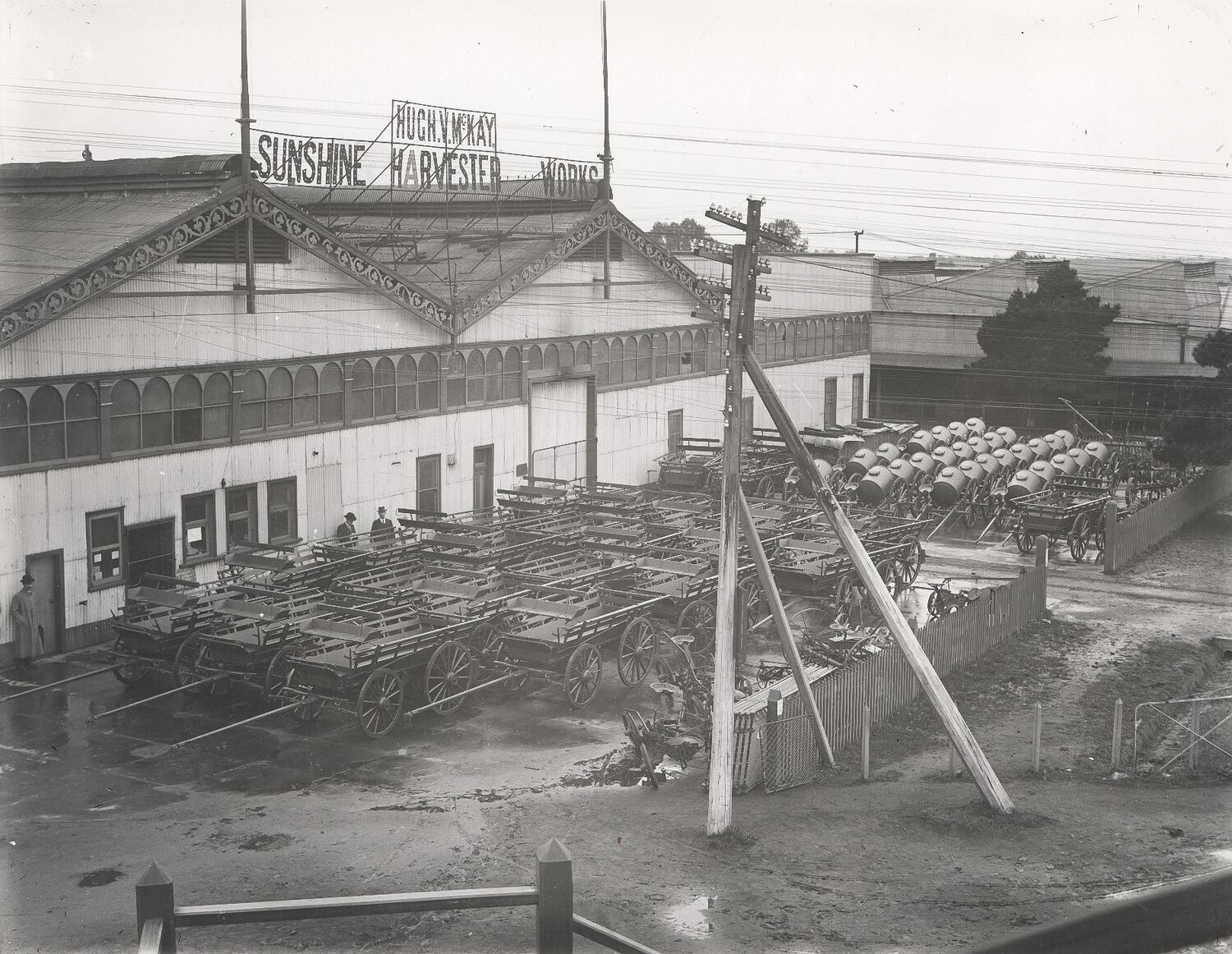 Storage of horse drawn carts and water wagons outside the Hugh V McKay Sunshine Harvester Works factory.