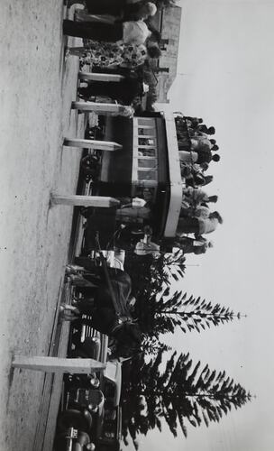 Black and white image of a group of people on a horse drawn tourist tramcar at Victor Harbour, circa 1940s. It is from a series of 27 travel photographs taken throughout Australia from the 1920s to the 1950s.