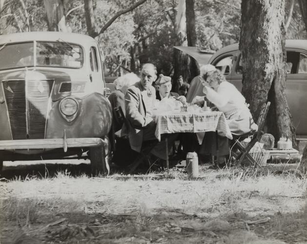 Bushland, Eating & Drinking, Food, Motor Cars, Motor Vehicles, Motoring, People, Picnics & Picnicking, Recreation Activities, Tables, Trees