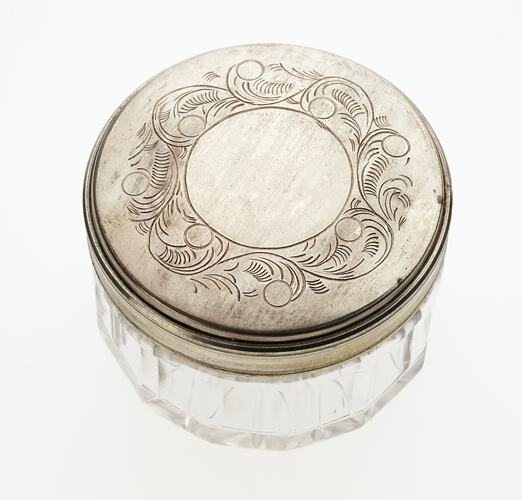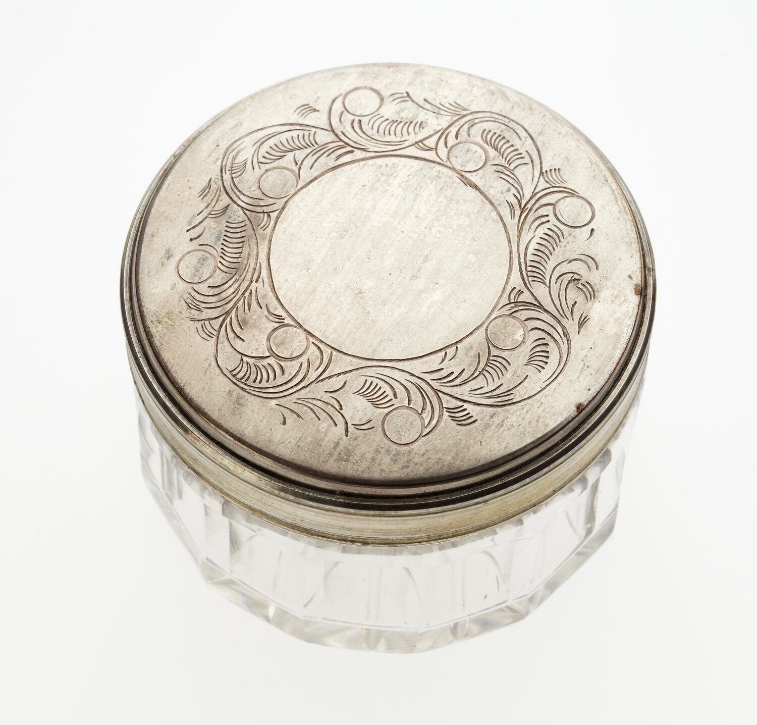 Circular glass container with decorative metal lid.