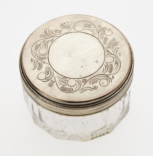 Circular glass container with decorative metal lid.
