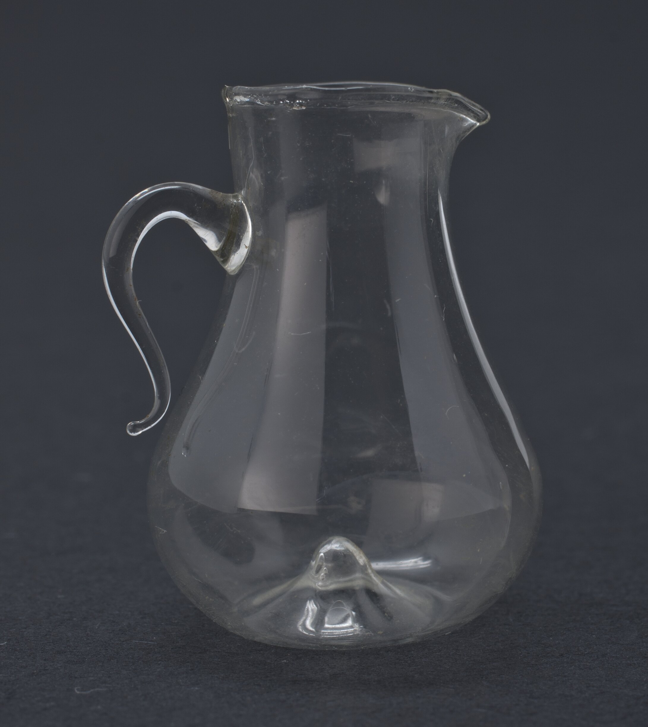 Clear glass jug with handle.