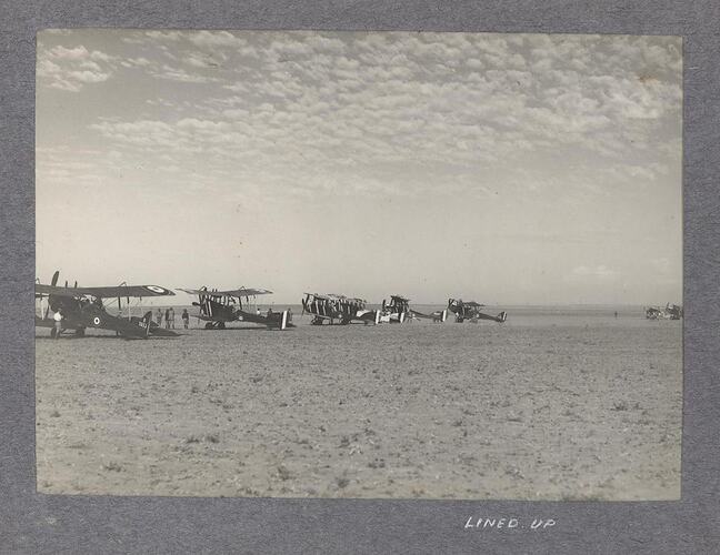 Photograph of a group of grounded aircraft of various types, most likely RE8s, at the No. 1 Australian Squadron base at Weli Sheikh Nuran. A similar photograph appears in the book 'Fire in the Sky: The Australian Flying Corps in the First World War' by Michael Molkenton, p. 78. This image also appears in the album ST 41221 (MM 114547).