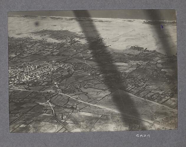 One of an album of 24 black and white photographs of the Middle East during World War I, probably taken by Australian Flying Corps photographer Norman Henry Clutterbuck, the maternal uncle of the previous owner Ray Kerby. The album mostly contains aerial photographs of locations around the Middle East including Jerusalem, Jericho, Gaza and Jaffa some of which appear to be duplicates of photographs found in the war diaries of the No. 1 Squadron, Australian Flying Corps, held at the Australian War Memorial. The album ST 41221, from the same source, contains copies of some of the images included in this album.