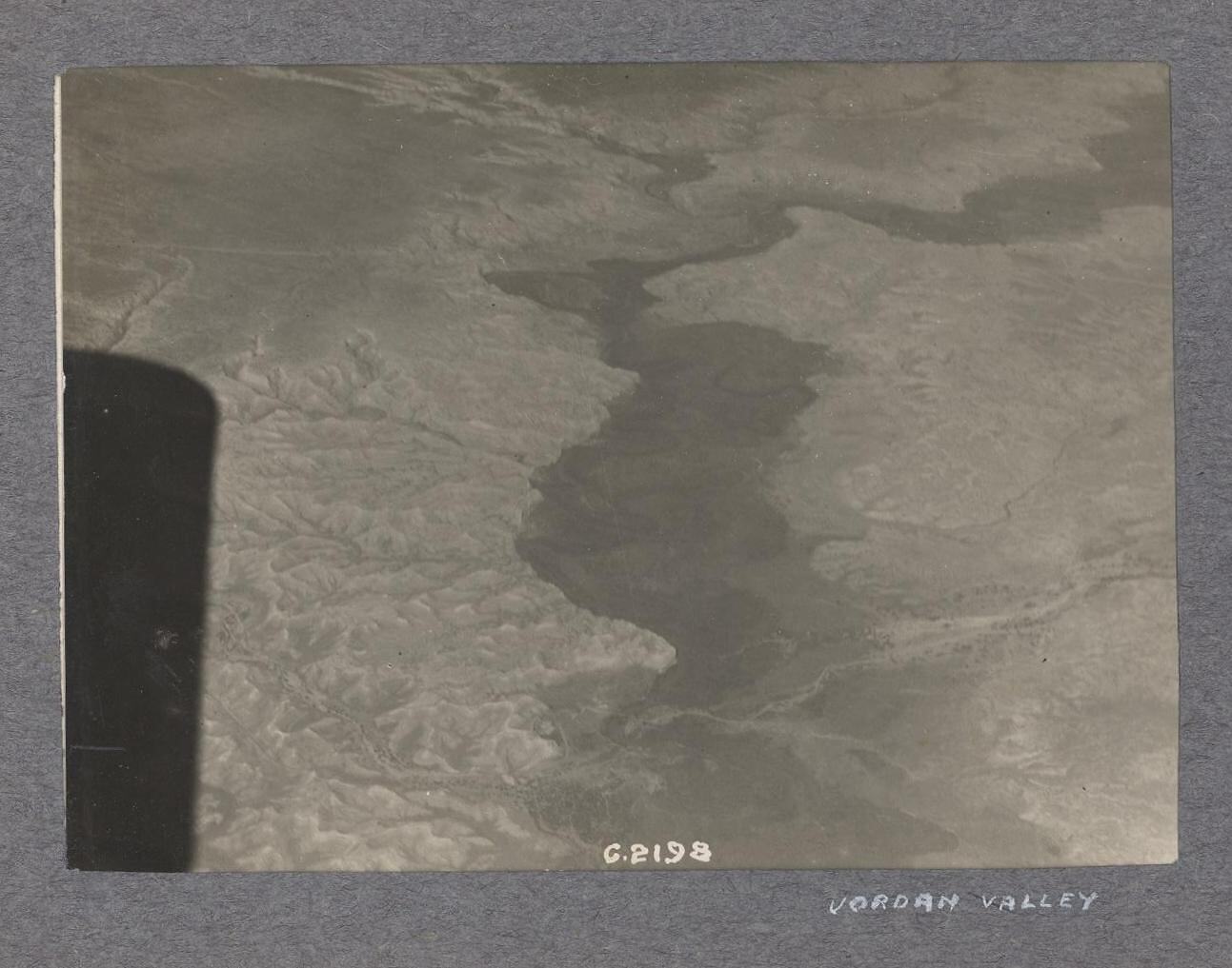 Aerial photograph of the Jordon Valley. This photograph can also be seen on page 5 of the January 1918 (Part 2) war diary of the No. 1 Squadron, Australian Flying Corp held at the Australian War Memorial. Both images are inscribed with 'c.2198' on the bottom margin of the photograph. This image also appears in the album ST 41221 (MM 112865).