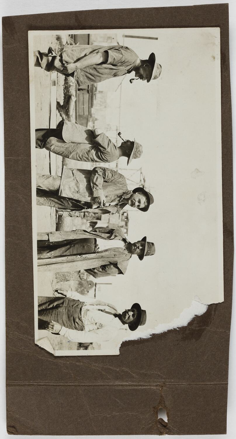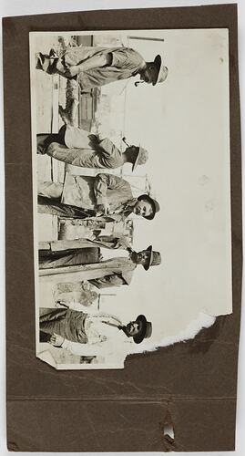 Group portrait showing five workmen at Kalgoorlie. Gold mining equipment and infrastructure is shown in the background.