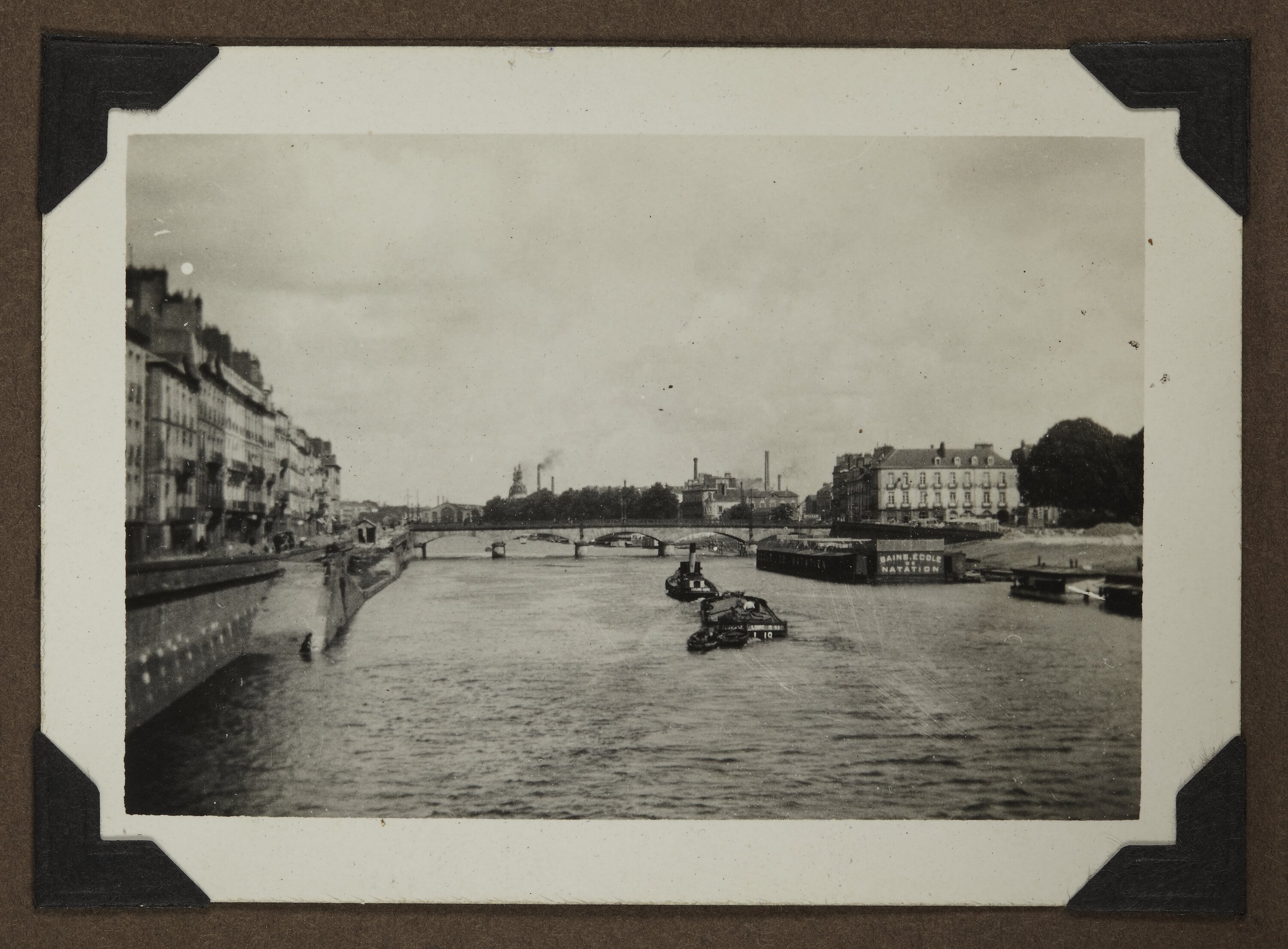 View of the River Loire in Nantes showing a bridge, boats and buildings. Factory buildings and chimneys are shown in the distance.