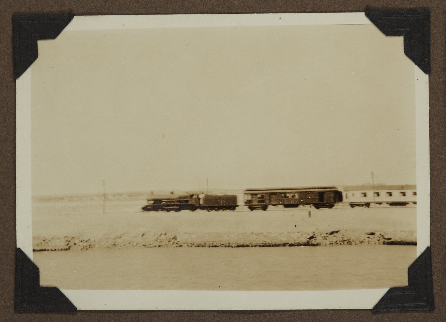 Steam train in motion with the Suez Canal in the foreground.