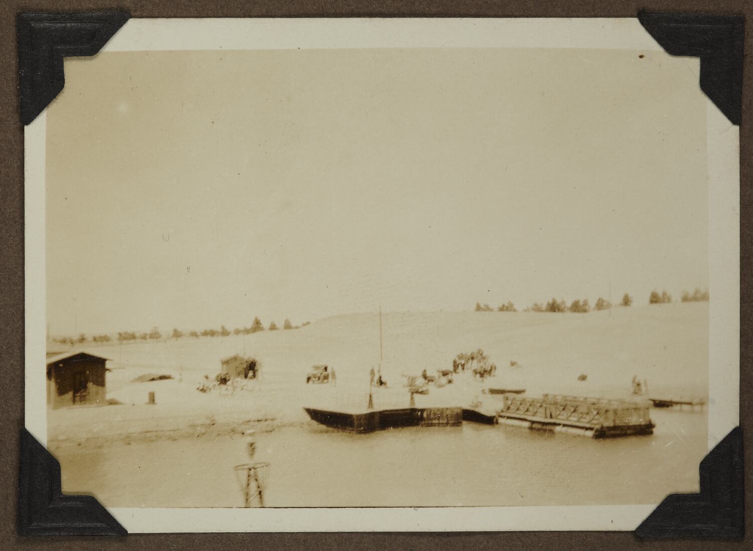 Landscape showing the Suez Canal and a pontoon in the foreground with buildings, camels and a motor car in the background.