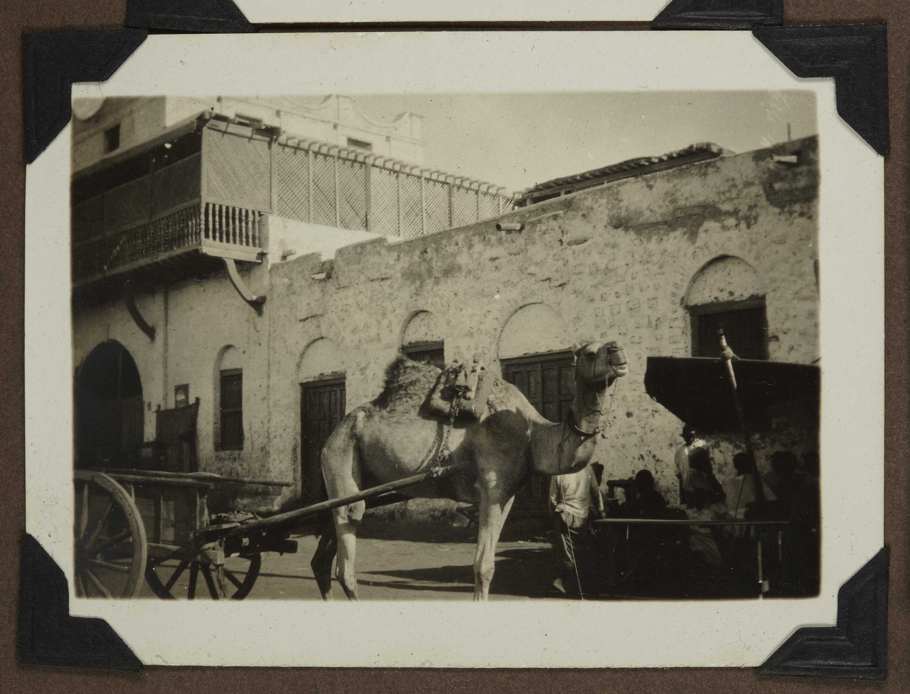 Street scene showing a camel cart in the foreground and buildings in the background. A group of men are pictured to the right.