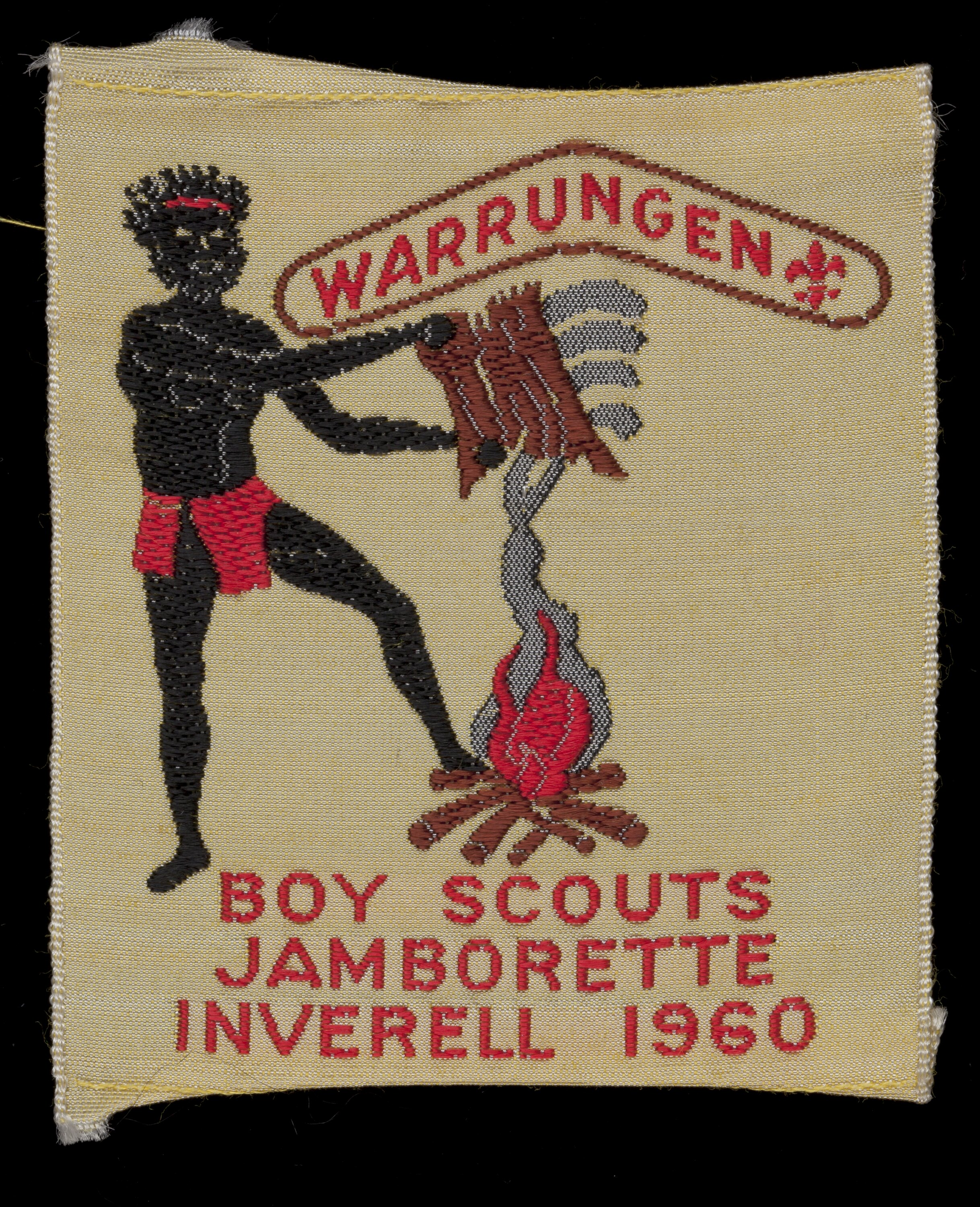Cloth badge issued by the Australian Boys Scout Association to commemorate the Boy Scouts Jamborette held at Inverell, New South Wales, in 1960, by the Warrungen (QLD) regional chapter. Its imagery includes a stereotypical figure of an indigenous man to symbolise the outdoor activities of the Jamborette.