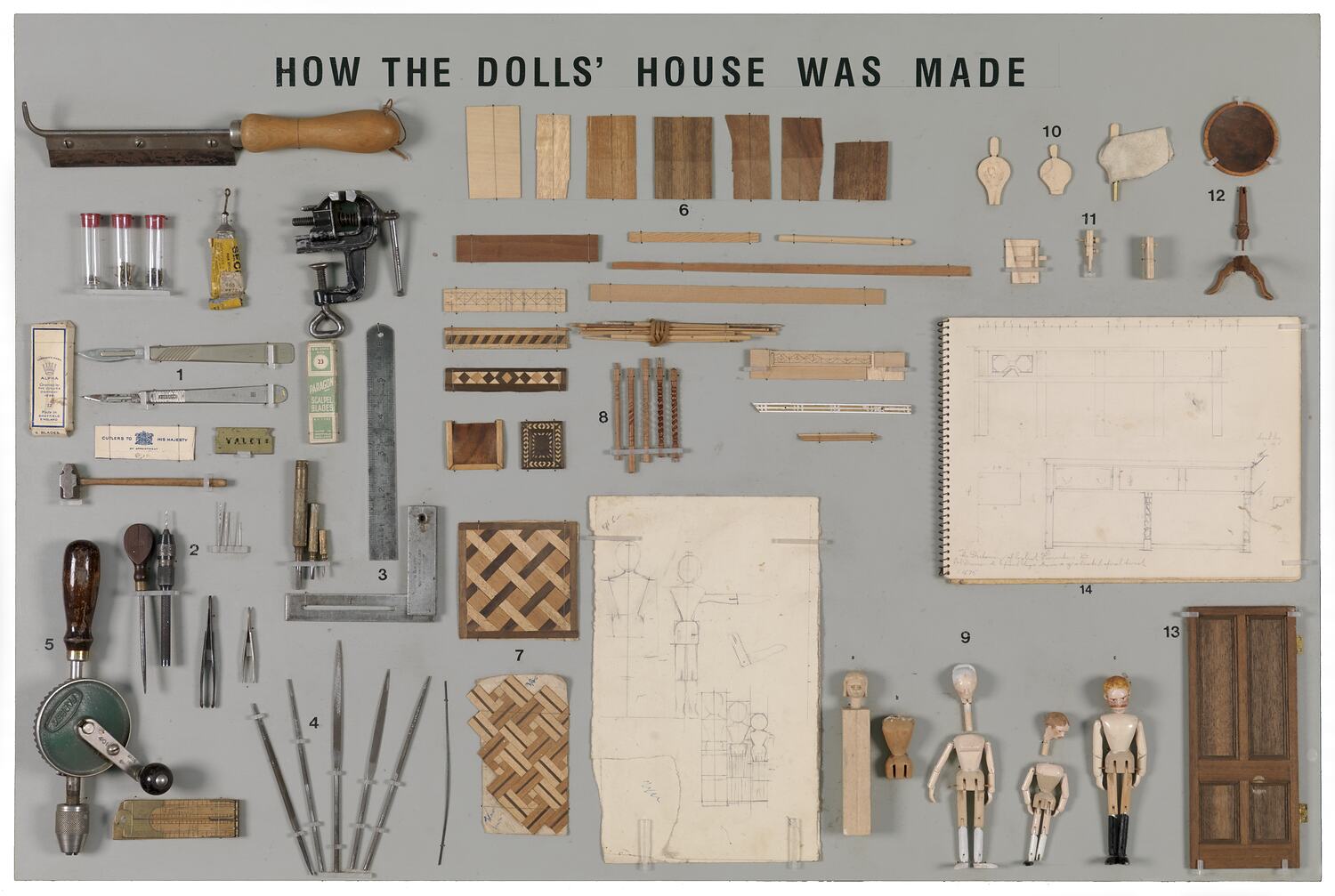 Rectangular board painted light grey with black text. The display board shows tools, drawings and samples of how the doll's house, people, furniture and flooring was made.