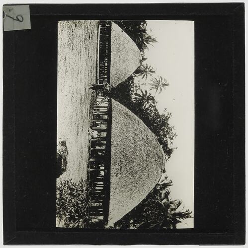 Lantern slide depicting two thatched buildings. Although the location of this image is unknown, it appears to depict a building of a style traditionally constructed in Samoa. In Samoa, Tonga and Fiji the word fale is used for traditional style houses.