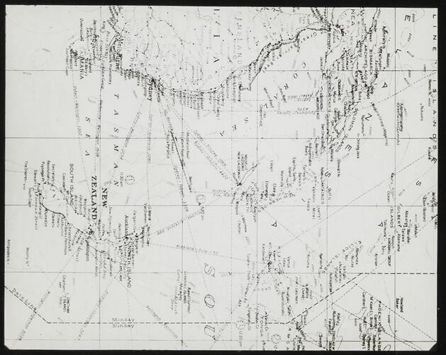 Lantern slide of map of New Zealand, New Caledonia, Fiji & Eastern Australia, circa 1920s. It shows routes and distances, and appears to be for sea voyages. It may represent the areas visited by the photographer of a collection of 55 photographic lantern slides, glass negatives and acetate negatives. The collection features travel images taken in the Pacific Islands, probably in the late 1930s.