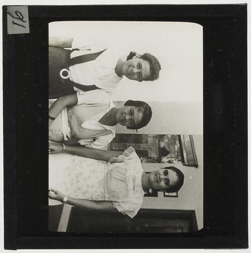 Lantern slide depicting three girls of Indian ethnicity. They may be from an orphanage as they are not wearing school uniforms (as was the norm in Fiji at the time, particularly for girls in senior years) but are wearing Western-style clothes.