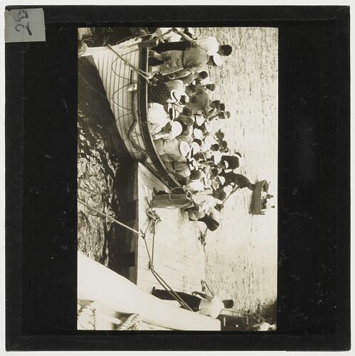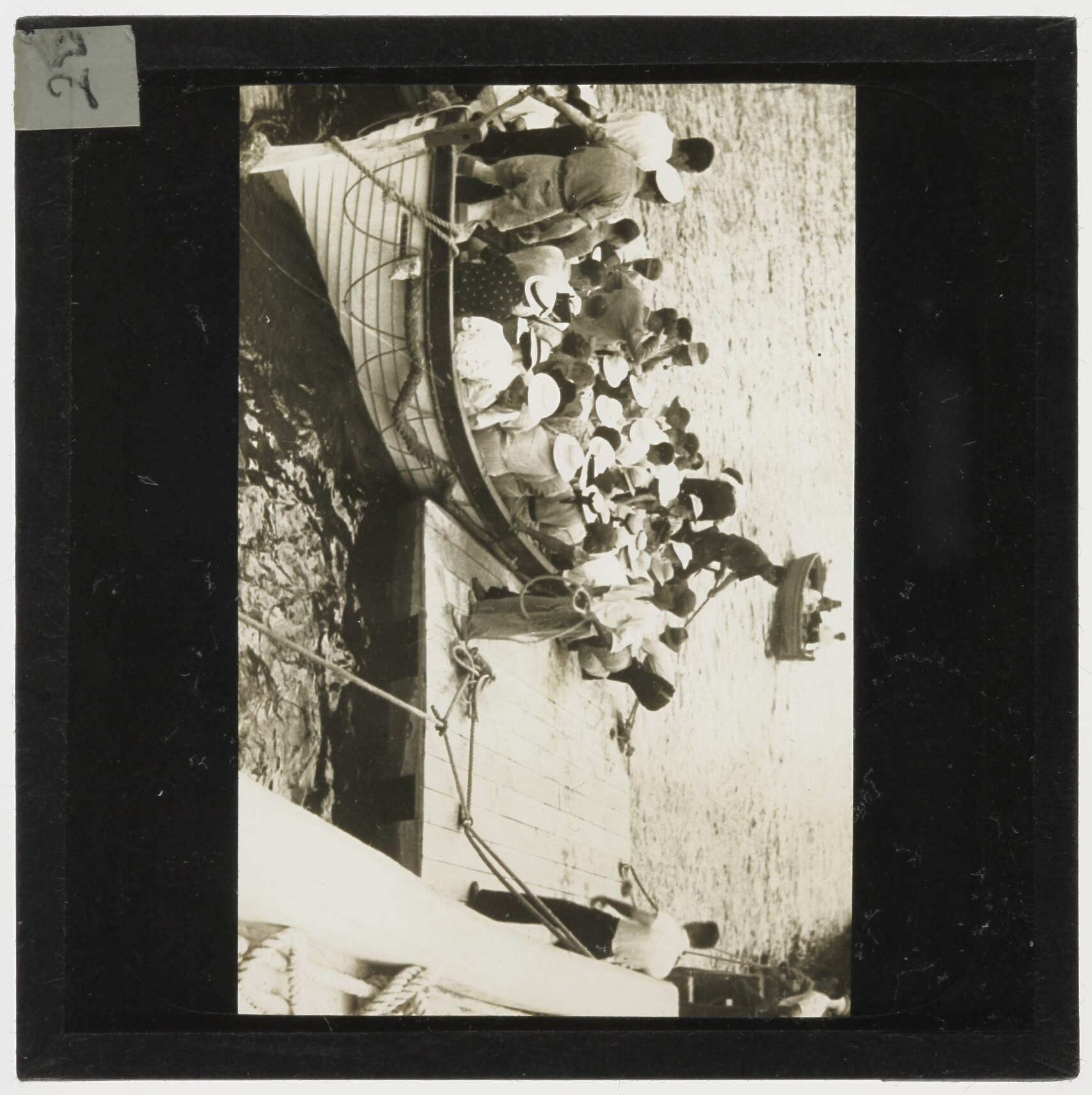 Lantern slide depicting a group of tourists on a boat.