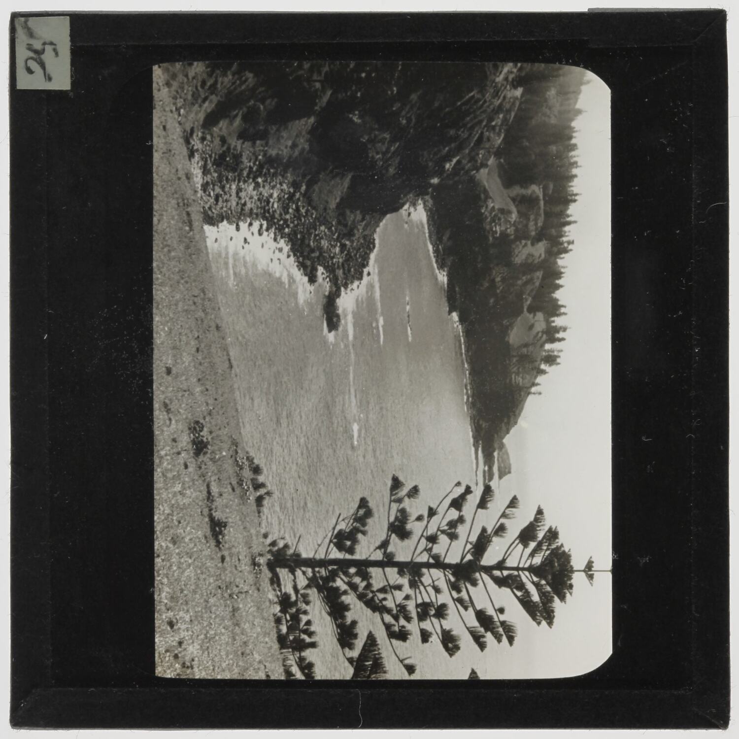 Part of a collection of 55 photographic lantern slides, glass negatives and acetate negatives of travel images taken in the Pacific Islands, probably in the late 1930s. The slide is numbered '25'.