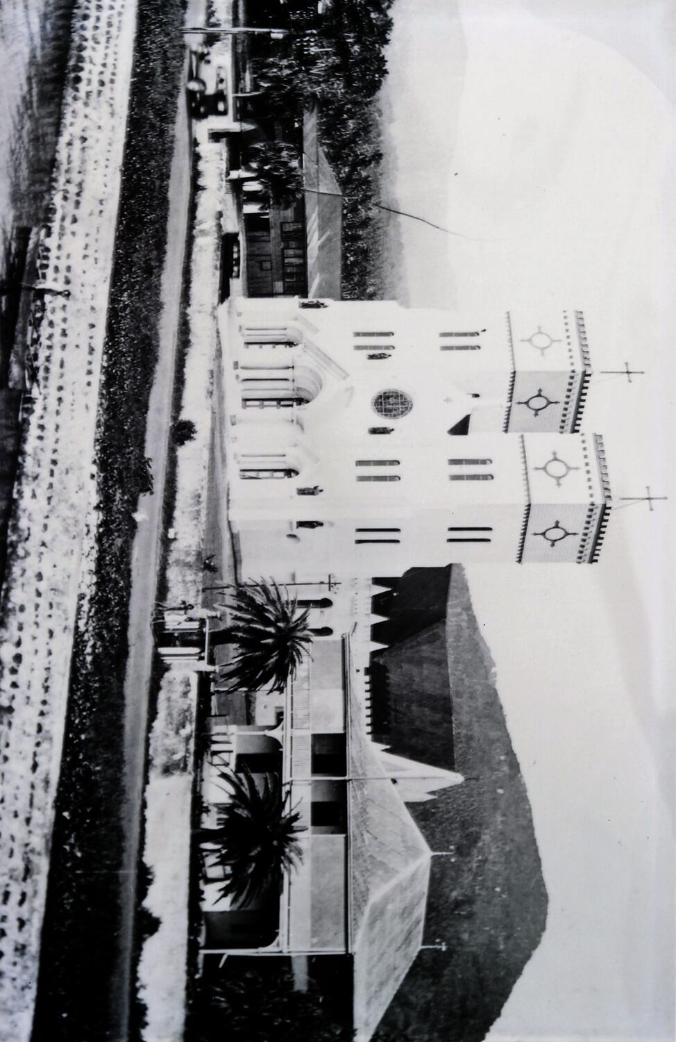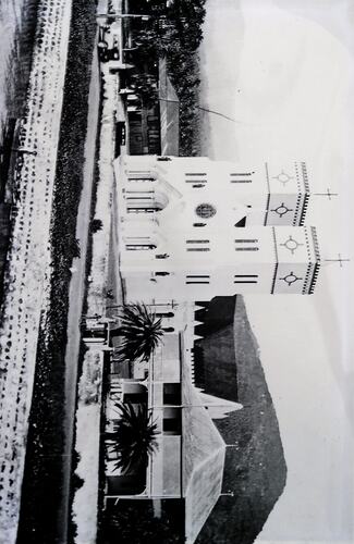 Lantern slide depicting the Catholic cathedral (church) and presbytery in Apia, Samoa.