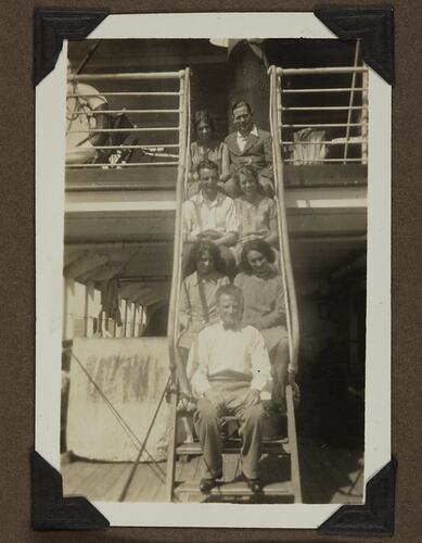 Three men and four women sitting on a staircase on board the HMS Jervis Bay, bound for Australia from the United Kingdom.