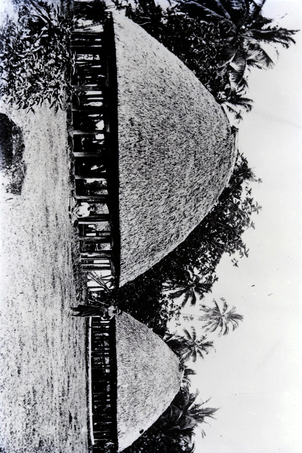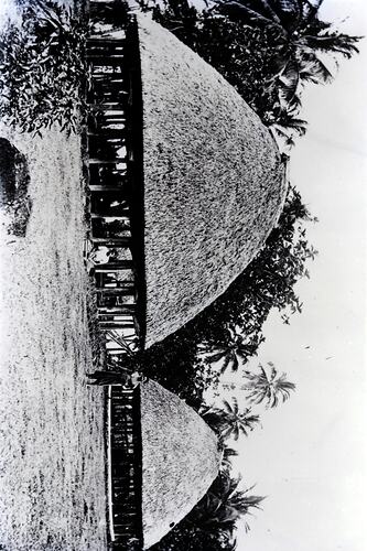 Negative depicting two thatched buildings, taken in the Pacific Islands in the 1930s. Although the location of this image is unknown, it appears to depict a building of a style traditionally constructed in Samoa. In Samoa, Tonga and Fiji the word fale is used for traditional style houses.