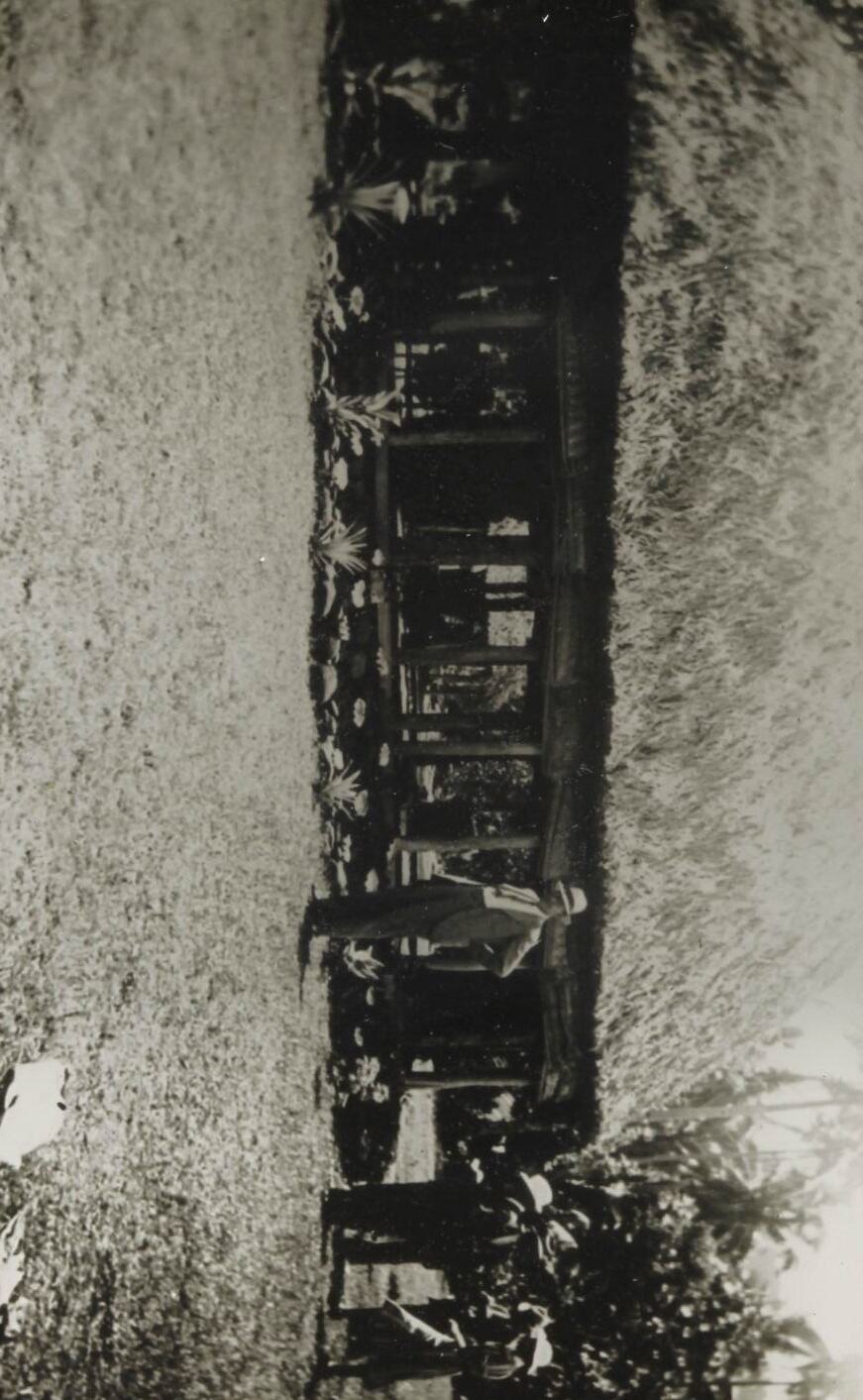 Glass negative depicting tourists outside a thatched building. Although the location of this image is unknown, it appears to depict a building of a style traditionally constructed in Samoa. In Samoa, Tonga and Fiji the word fale is used for traditional style houses.