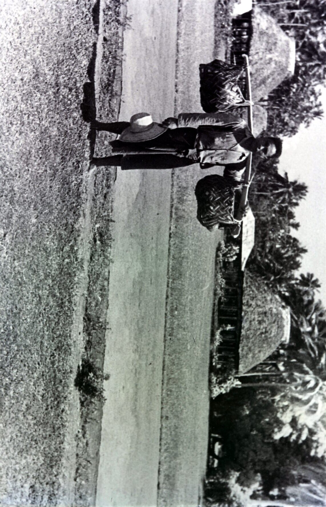 A man carrying two baskets on a pole stands in a field. Large grass buildings are pictured in the background.