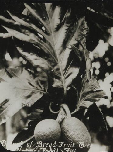 Glass negative of bread fruit tree bearing fruit.