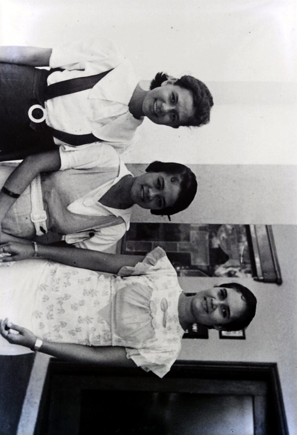 Negative depicting three girls of Indian ethnicity. They may be from an orphanage as they are not wearing school uniforms (as was the norm, particularly for girls in senior years) but are wearing Western-style clothes.