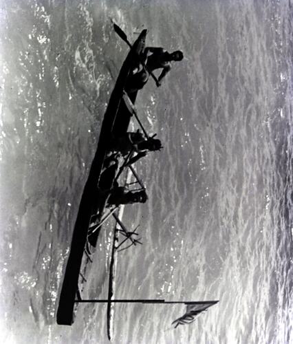Negative depicting three men in a canoe.