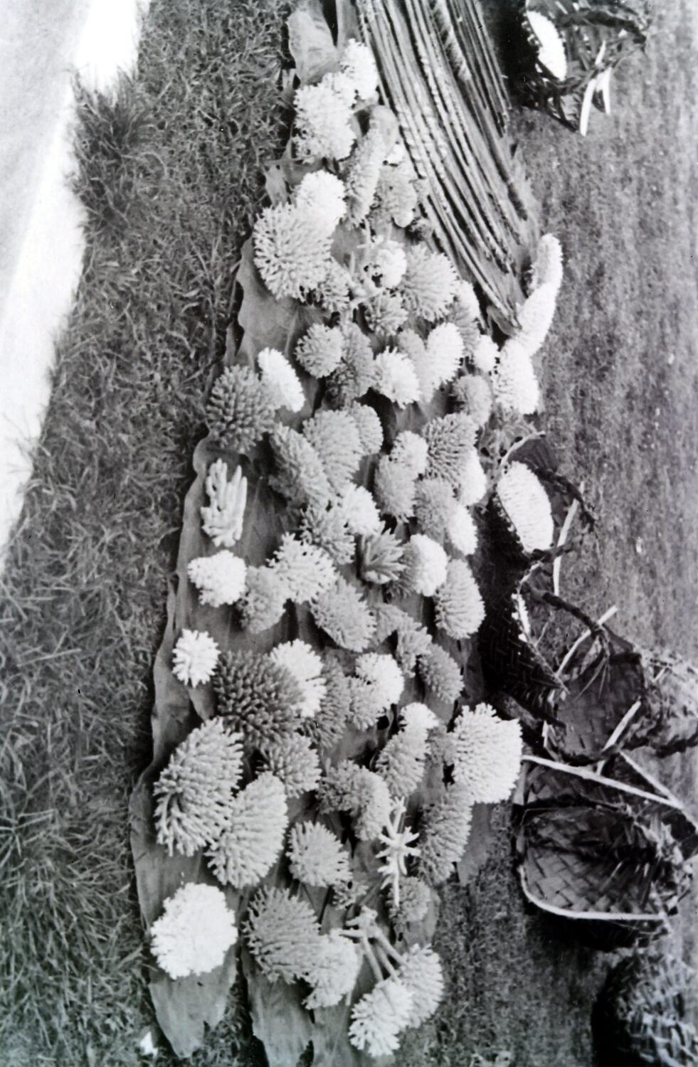 A collection of coral laid out on leaves. Woven baskets are pictured behind the collection.