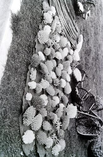 Display of coral on mats, with baskets and spears adjacent.