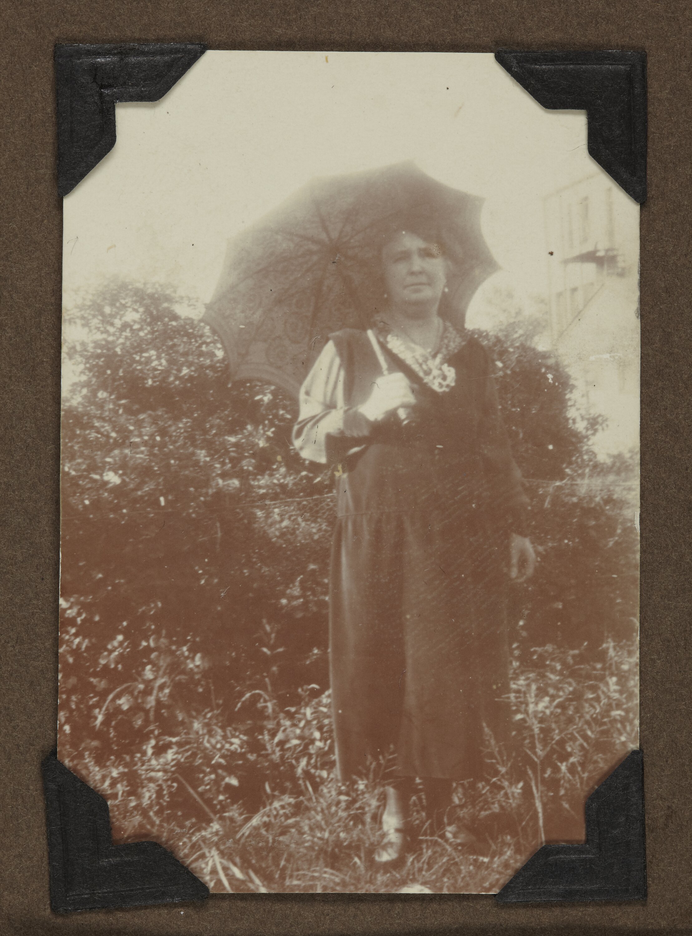 Hand written in black ink on back of photograph: 'Our mother. / note the sun shade / not / umbrella.'