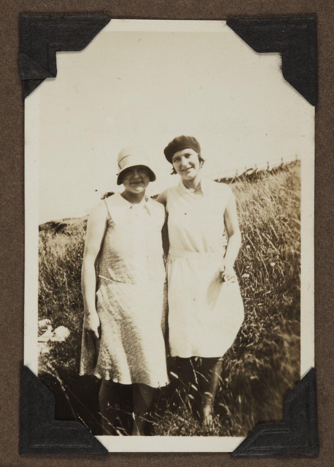 Portrait of two women in dresses standing in the grass at Herne Bay, Kent.