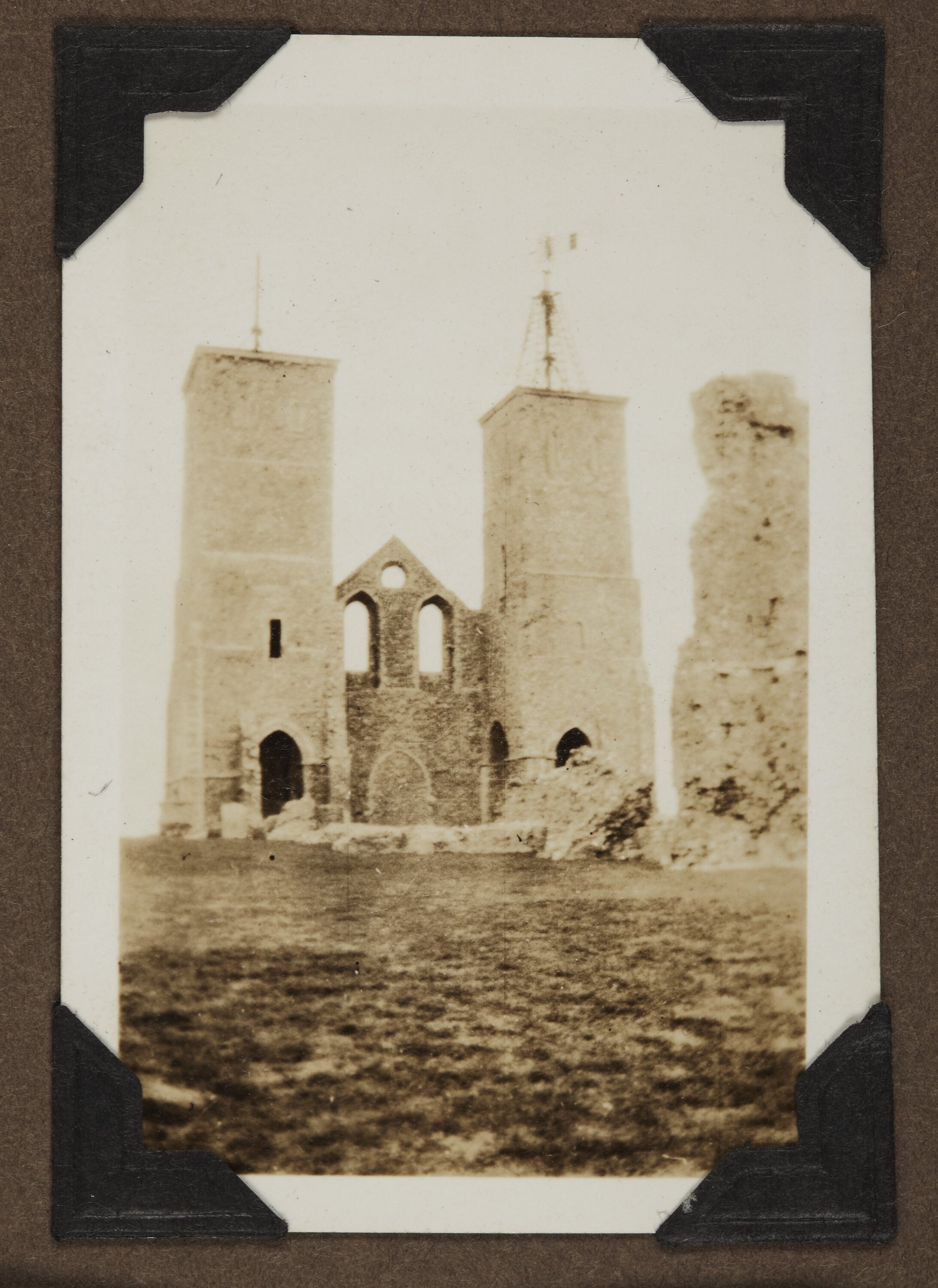 Printed in grey ink on back of photograph: 'VELOX.' [repeated] Hand written in black ink on back of photograph: 'The twin towers at Reculver. 5 seconds / exposure / I expect you have / seen them before'
