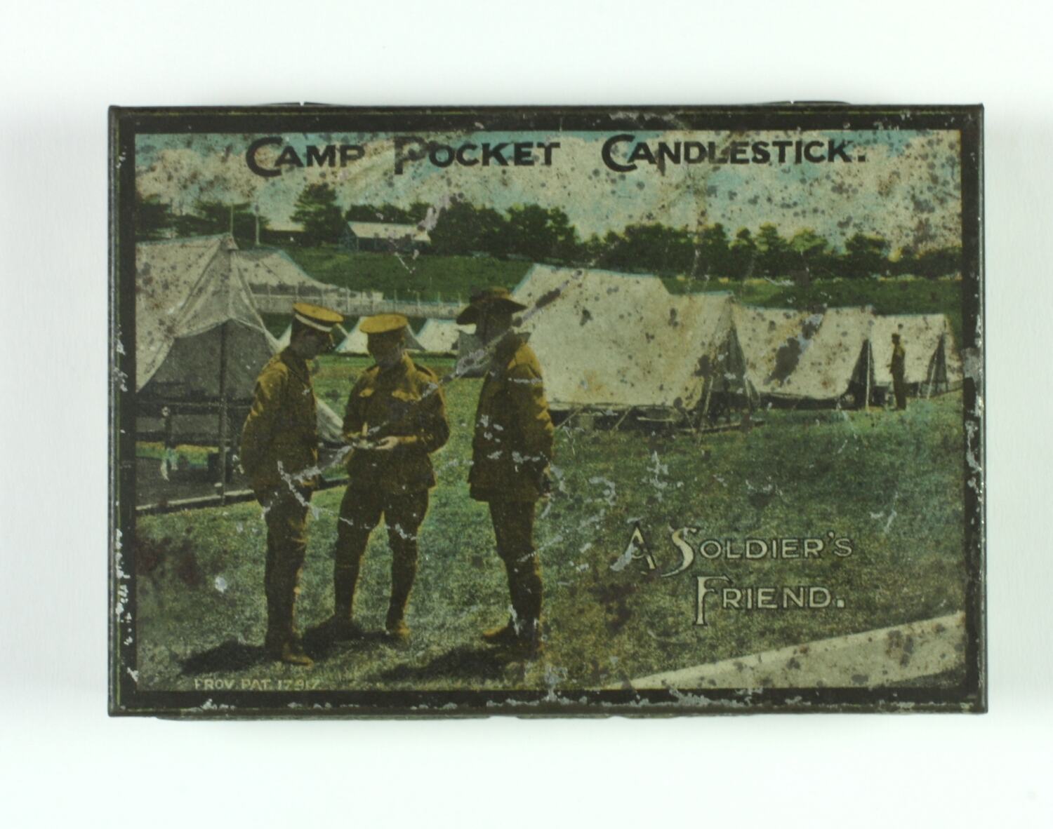 The Australian War Memorial explains that camp pocket candlestick was apparently made in Australia from 1915 (it was patented 9/7/1915), and could be purchased by Australian troops prior to their departure overseas. The tin was intended to keep the contents dry and readily available, and the lid may have helped shield the flame from wind. Note that the Australian War Memorial's two examples have losses from the front, as does this example. The fact that the camp pocket candlestick was intended to be taken to war perhaps explains its poor condition, although the fact that it remains unused suggests otherwise.