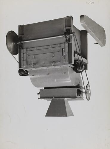 Black and white promotional image of a disc mill machine. It is part of a collection of photographs and marked printer's copy used in the preparation of trade literature promoting products manufactured by the Schumacher Mill Furnishing Works Pty Ltd. The items were originally housed in a wooden filing drawer, with many filed by subject. This photograph was previously filed under 'Disc Mills'.
