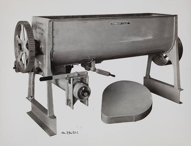 Printed in black ink on back of photograph: 'SCHUMACHER MILL FURNISHING WORKS PTY. LTD. / GRAHAM STREET. PORT MELBOURNE. / S. C. 7 VICTORIA. / TELEPHONE MX 2171' Printed in red ink on back of photograph: 'MIXING EQUIPMENT.' Hand written in black ink on front of photograph: 'No. 39452-1.' Printed in purple ink on back of photograph: 'Kerr / BROS. / COMMERCIAL / PHOTOGRAPHERS / 533 COLLINS ST. MELBOURNE'