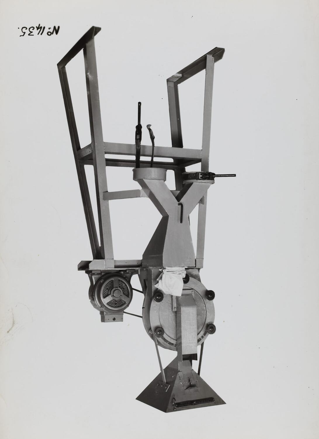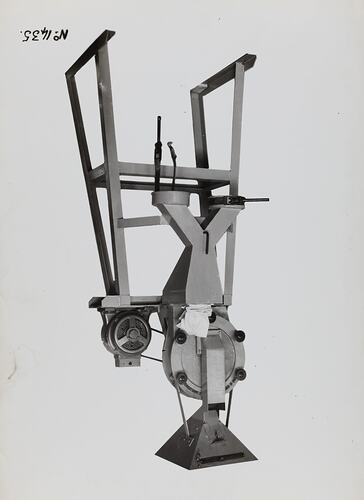 Black and white promotional image of a machine. It is part of a collection of photographs and marked printer's copy used in the preparation of trade literature promoting products manufactured by the Schumacher Mill Furnishing Works Pty Ltd. The items were originally housed in a wooden filing drawer, with many filed by subject. This photograph was previously filed under 'GRAVITY'.