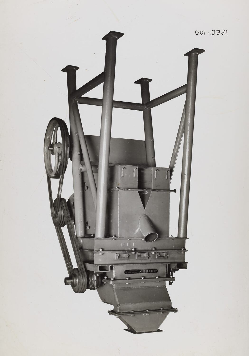 Black and white promotional image of a machine. It is part of a collection of photographs and marked printer's copy used in the preparation of trade literature promoting products manufactured by the Schumacher Mill Furnishing Works Pty Ltd. The items were originally housed in a wooden filing drawer, with many filed by subject. This photograph was previously filed under 'GRAVITY'.
