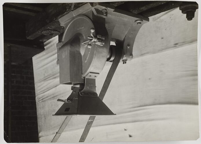 Black and white promotional image of a machine. It is part of a collection of photographs and marked printer's copy used in the preparation of trade literature promoting products manufactured by the Schumacher Mill Furnishing Works Pty Ltd. The items were originally housed in a wooden filing drawer, with many filed by subject. This photograph was previously filed under 'GRAVITY'.