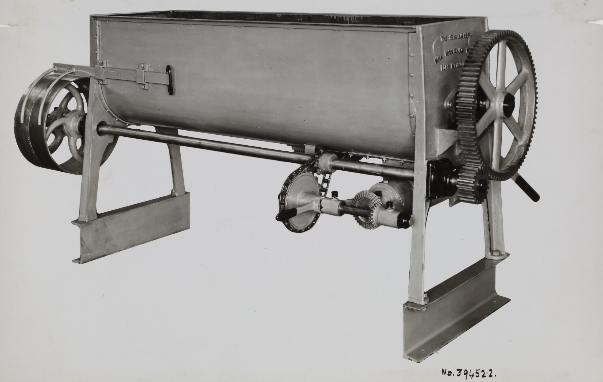 Black and white promotional image of mixing equipment. It is part of a collection of photographs and marked printer's copy used in the preparation of trade literature promoting products manufactured by the Schumacher Mill Furnishing Works Pty Ltd. The items were originally housed in a wooden filing drawer, with many filed by subject. This photograph was previously filed under 'Misc'.