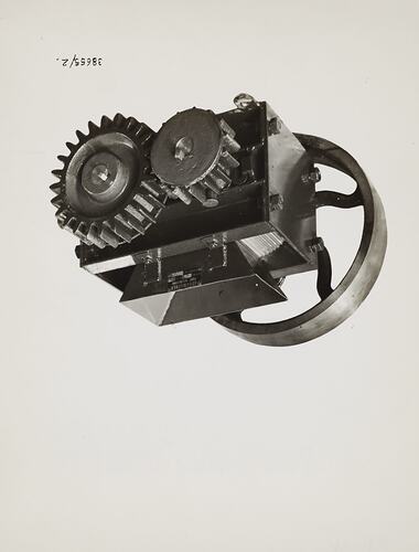 Printed in black ink on the back of photograph: 'SCHUMACHER MILL FURNISHING WORKS PTY. LTD. / GRAHAM STREET. PORT MELBOURNE. / S.C. 7. VICTORIA. / TELEPHONE MX 2171' Printed in purple ink on back of photograph: 'Kerr / BROS. / COMMERCIAL / PHOTOGRAPHERS / 533 COLLINS ST. MELBOURNE' Handwritten in black ink on the front of photograph: 'No 103 / Gringer Crusher - / to O/N 38655 - 19/7/39' Handwritten in black ink on the front of photograph: '38655/2.'