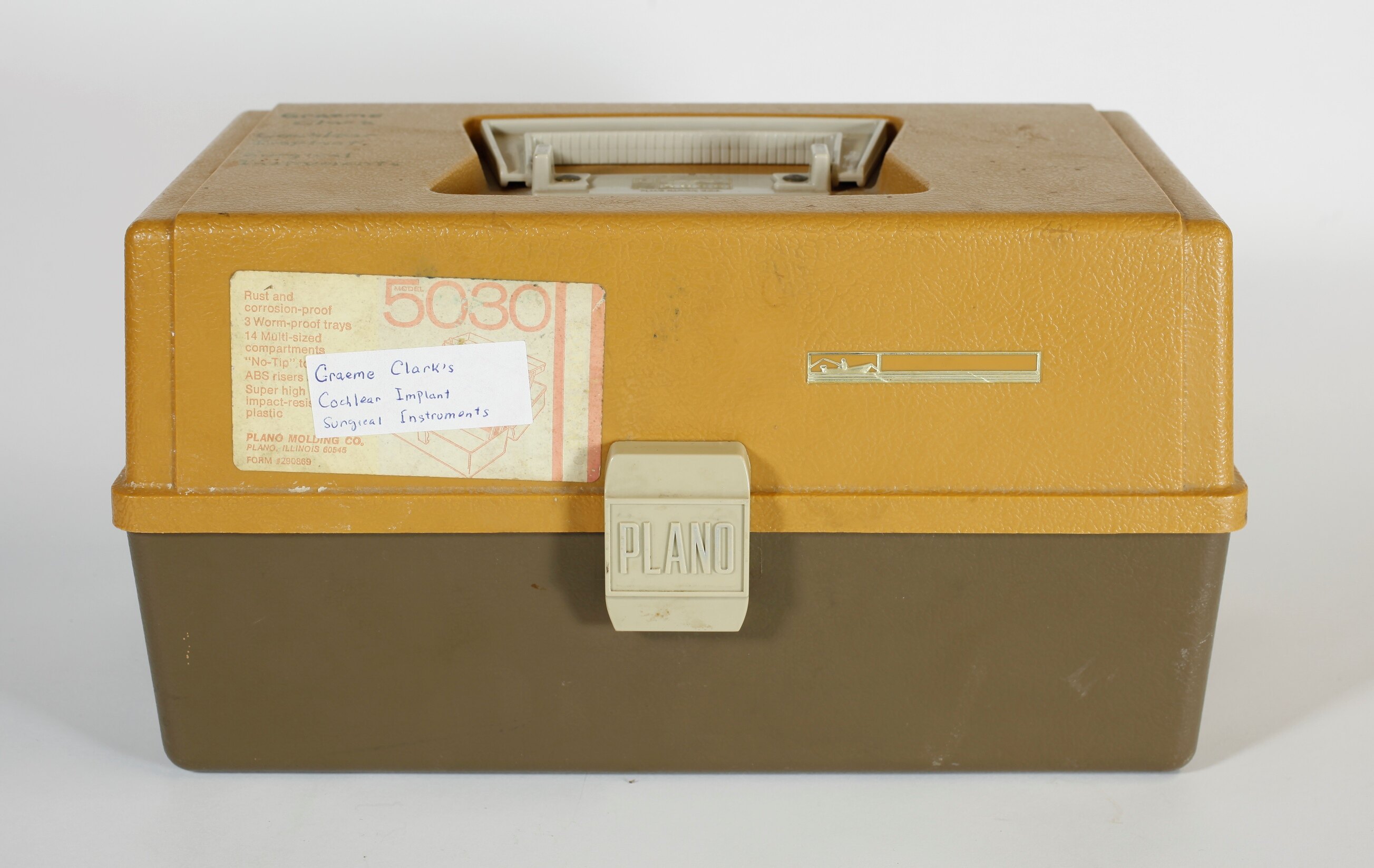 Plastic fishing tackle box used to hold surgical tools used in the original cochlear implant surgery by Graeme Clark.