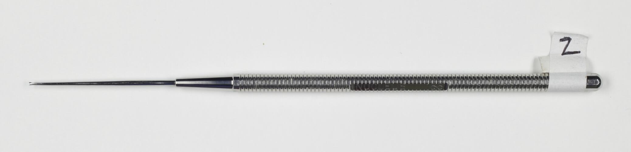 Surgical instrument used to insert the electrode bundle of the cochlear implant into the inner ear.