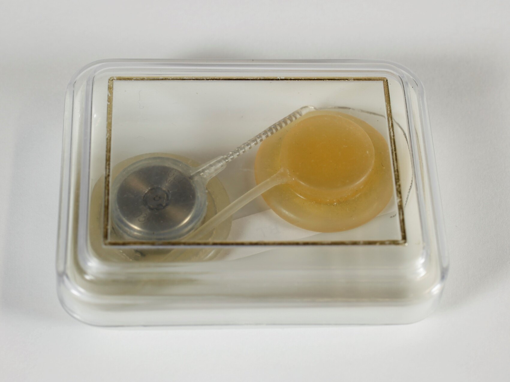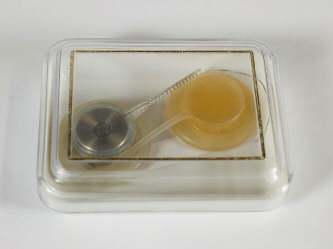 Clear plastic and silver metal wearable device with circular main component and tail. Yellowed plastic dummy device with circular main component and tail. Inside a plastic container with opaque white base and clear lid with gold trim.